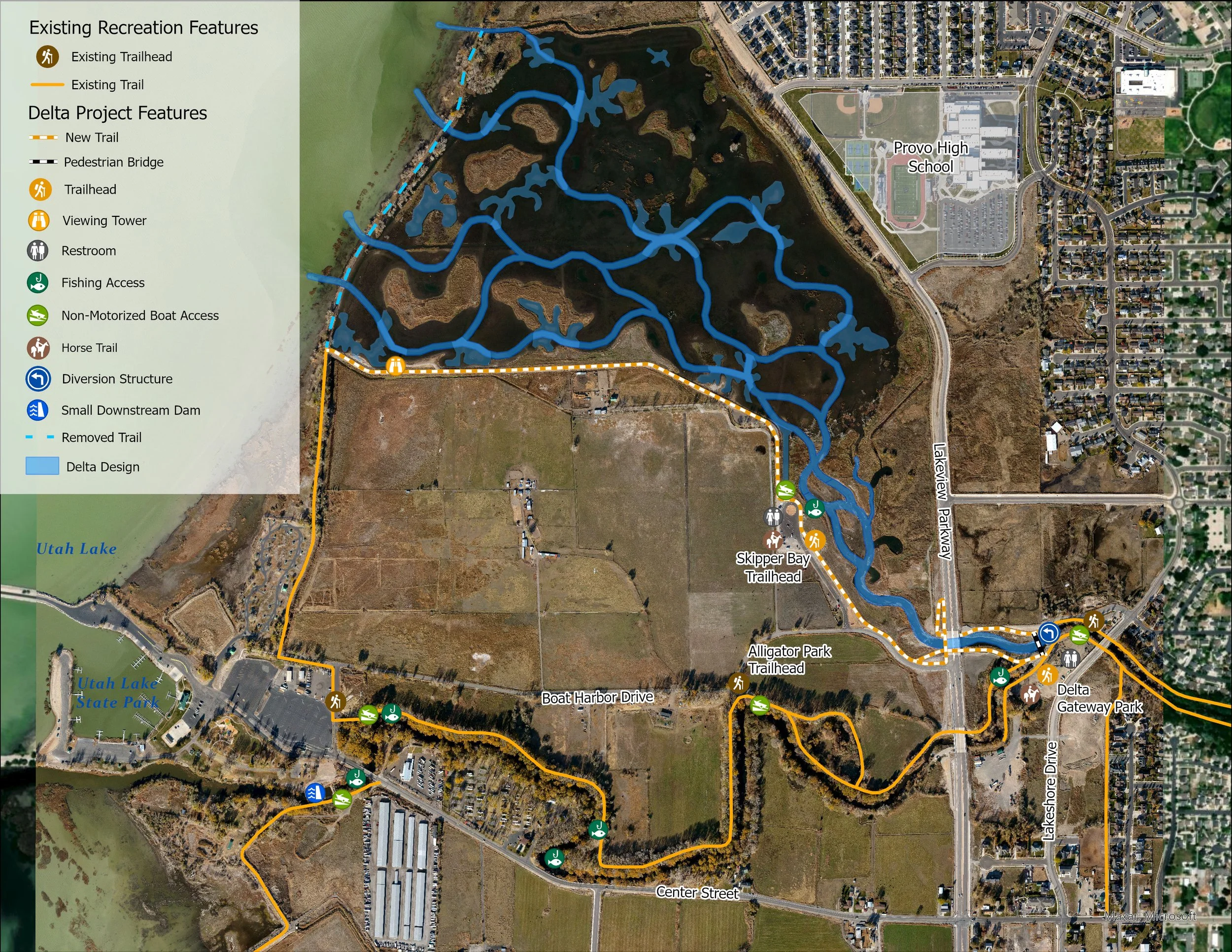Construction of new recreational amenities on the original channel are scheduled for construction in late fall of 2025. These include three new fishing platforms and two non-motorized boat ramps - one at Alligator Park, and the other at the trailhead near Utah Lake State Park. The Delta project has provided funding to Utah County to repave the trail along the channel from Lakeshore Drive to Utah Lake State Park. This paving work will take place after the boat ramps and fishing platforms are complete.